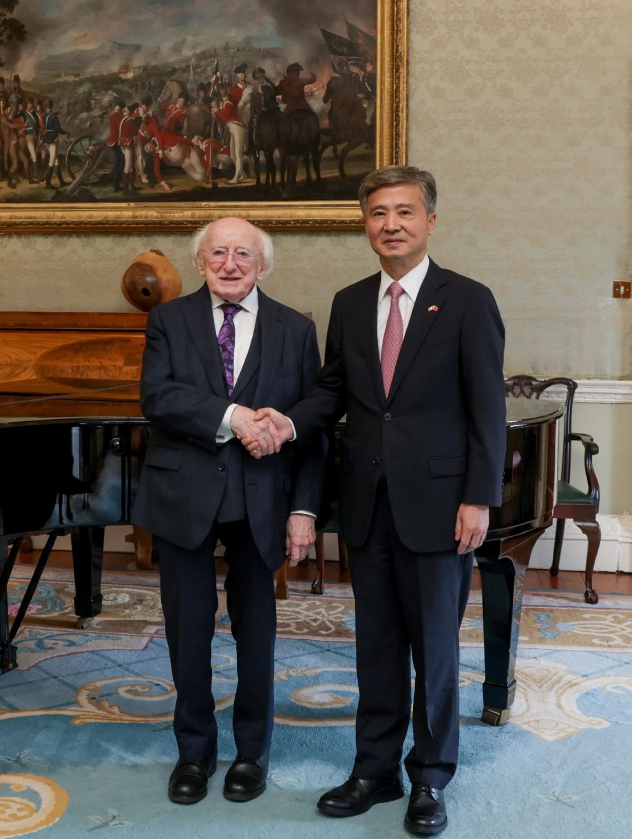 何大使转达习近平主席对希金斯总统的亲切问候,感谢希金斯总统及爱尔兰政府对他任内工作的大力支持,表示在习近平主席和总统阁下的战略引领下,中爱关系保持稳健发展势头。中方愿同爱方一道,落实好两国元首重要共识,推动中爱互惠战略伙伴关系取得更大发展。希金斯总统请何大使转达对习近平主席的良好祝愿,赞赏何大使任内为促进爱中关系所作贡献并祝何大使一切顺利。希金斯总统表示,中国是世界大国,是爱尔兰重要合作伙伴。两国建交以来一直保持着友好交往,各领域合作稳步发展。爱方愿进一步深化同中方的互利合作,推动双边关系不断深入发展。